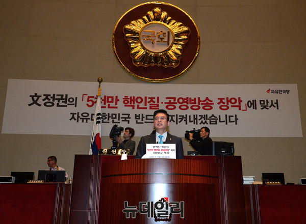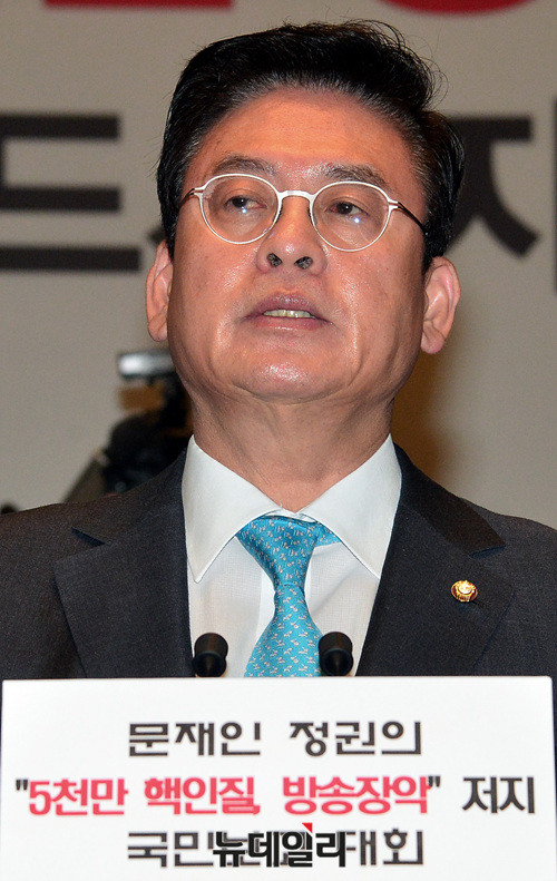 정우택 자유한국당 원내대표가 7일 오전 국회에서 열린 '비상의원총회 및 방송장악저지 대토론회'에서 발언하고 있다.