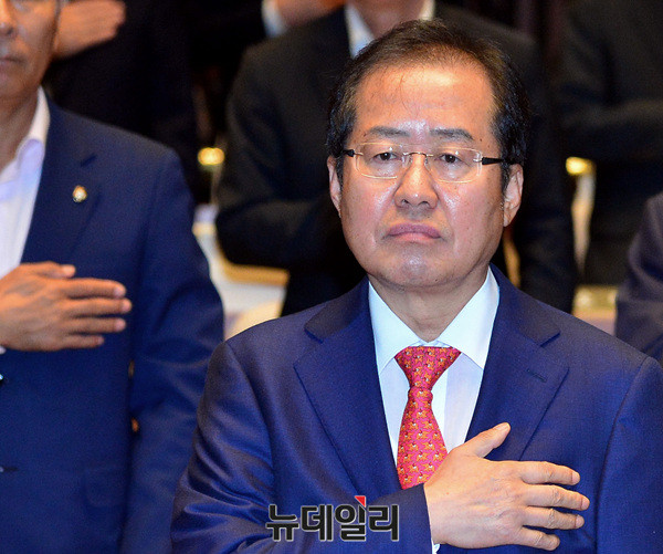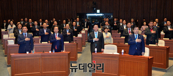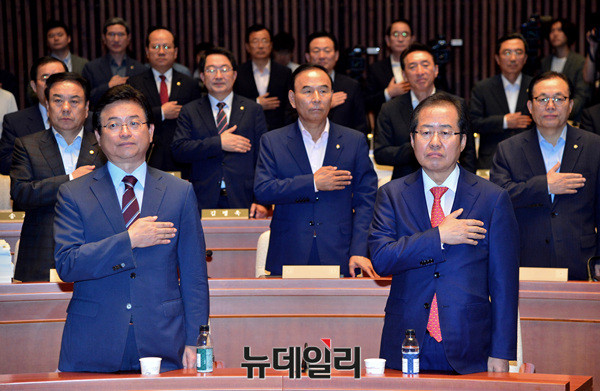 홍준표 자유한국당 대표가 7일 오전 국회에서 열린 '비상의원총회 및 방송장악저지 대토론회'에서 국민의례하고 있다.