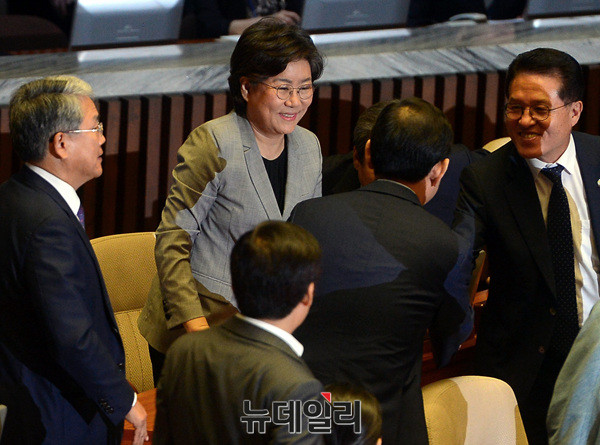이혜훈 바른정당 전 대표와 김무성 의원이 7일 오전 국회에서 열린 '제354회 국회 정기회 제4차 본회의'에서 교섭단체 대표연설 후 악수하는 주호영 원내대표를 보고 있다. 이 전 대표는 앞서 의원 전체회의에서 당 대표직을 자진사퇴 했다.