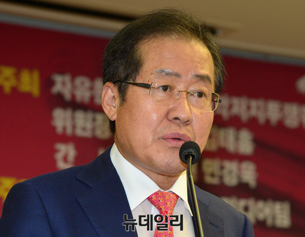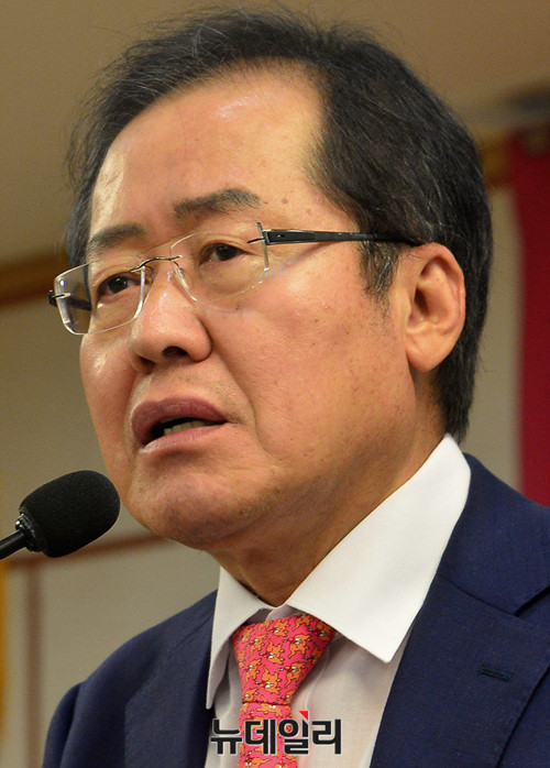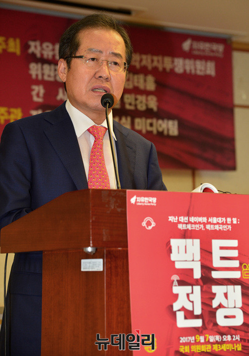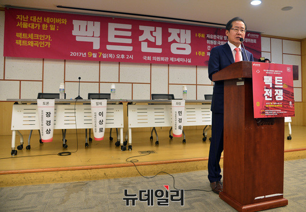 홍준표 자유한국당 대표가 7일 오후 국회의원회관에서 열린 '팩트전쟁' 토론회에서 축사를 하고 있다.