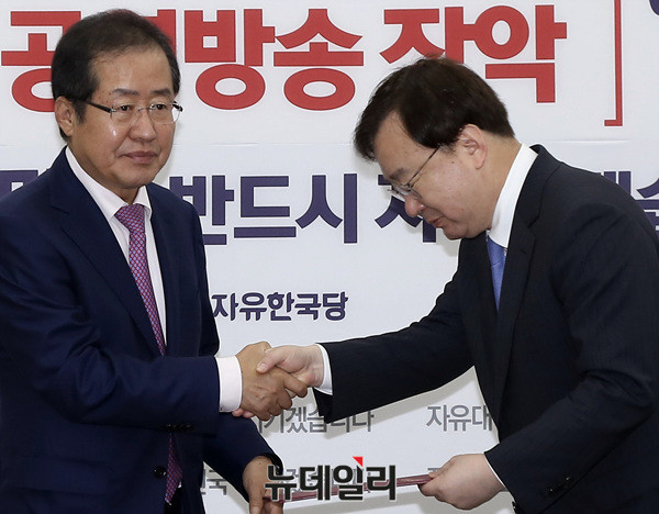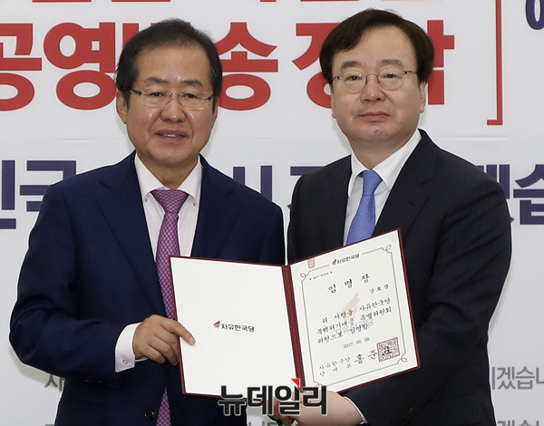 홍준표 자유한국당 대표와 강효상 '북핵위기대응 특별위원'이 임명장 수여식을 마치고 기념촬영을 하고 있다.
