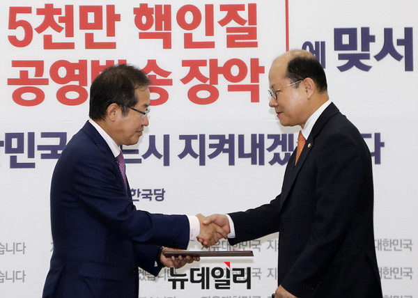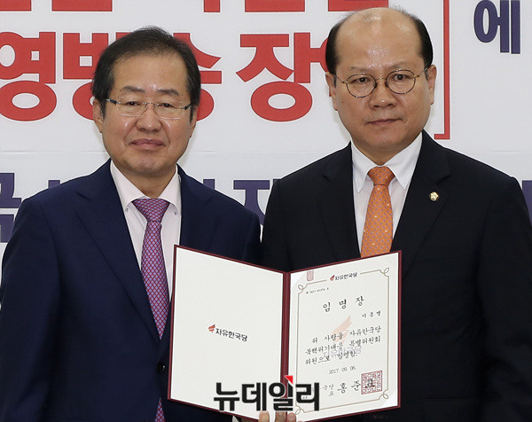 홍준표 자유한국당 대표가 이종명 의원에게 '북핵위기대응 특별위원' 임명장을 수여하고 있다.