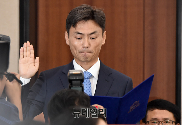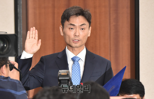 박성진 중소벤처기업부 장관 후보자가 11일 오전 국회에서 열린 인사청문회에 출석해 선서를 하고 있다.