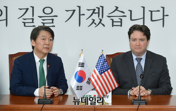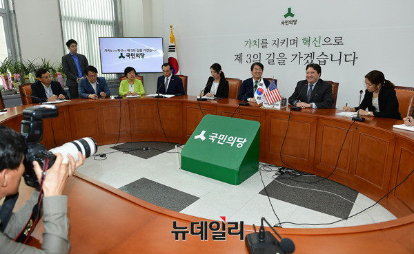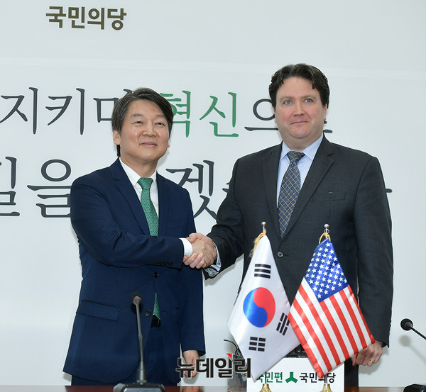 안철수 국민의당 대표가 11일 오후 국회 국민의당 대표실에서 마크 내퍼 주한미국대사 대리와 악수를 나누고 있다. 안 대표는 이어 찰스 헤이 주한영국대사를 접견할 예정이다.