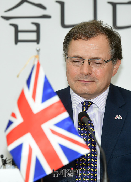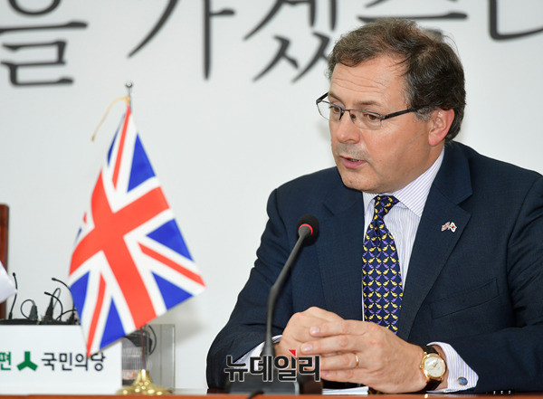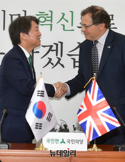 찰스 존 헤이 주한영국대사가 11일 오후 국회 국민의당 대표실에서 안철수 대표를 접견하고 자리하고 있다. 안 대표는 앞서 마크 내퍼 주한미국대사 대리를 접견했다.