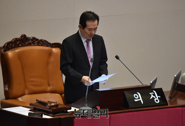 정세균 국회의장이 11일 오후 국회에서 열린 본회의에서 김이수 헌법재판소장 임명동의안 투표 결과를 발표하고 있다.