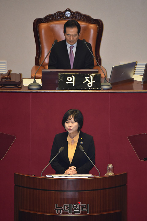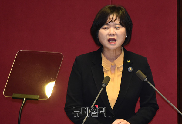 이정미 정의당 대표가 11일 국회에서 열린 본회의에서 비교섭단체대표연설을 하고 있다.