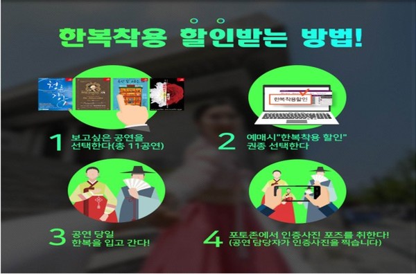 세종문화회관 홈페이지에서 공연 예매 시 '한복착용 관람료 할인' 메뉴를 선택하면 사전 예매할 수 있으며, 현장 매표소 옆에 마련된 포토존에서 한복 착용 인증사진을 촬영해 제출하면 반값 티켓을 구매할 수 있다.