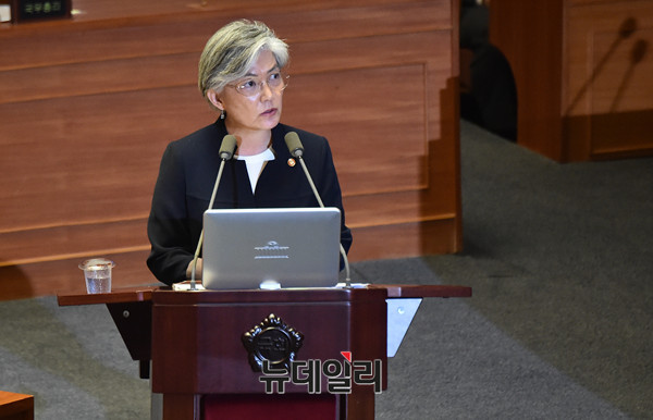 강경화 외교부 장관이 12일 오후 국회에서 열린 외교·통일·안보 분야 대정부질문에서 의원들의 질문에 답하고 있다.