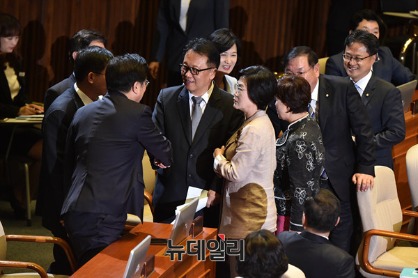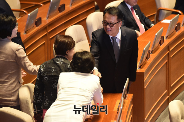 [포토] 동료 의원들과 인사 나누는 더불어민주당 민병두 의원