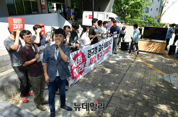 성재호 민노총 산별노조인 언론노조 KBS본부장이 12일 오후 서울 서대문구 명지대학교 학생회관 앞에서 열린 'KBS 강규형 이사 사퇴 촉구 기자회견'에서 발언하고 있다.
