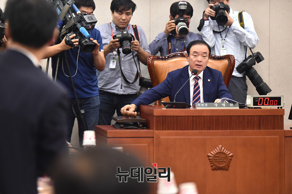 장병완 산업통상자원위원장이 13일 오후 국회에서 열린 산업통상자원중소벤처기업위원회 전체회의에서 박성진 중소벤처기업부 장관 후보자에 대해 부적격 인사청문 보고서를 상정하자 여댱 의원들이 회의장을 빠져나가고 있다.