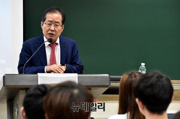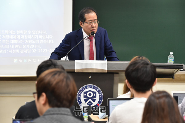 자유한국당 홍준표 대표가 14일 오전 서울 서대문구 연세대학교 연희관에서 류석춘 혁신위원장이 초청한 특강을 하고 있다.