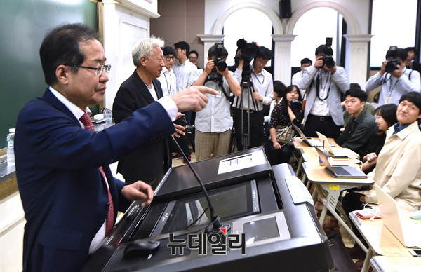 자유한국당 홍준표 대표가 14일 오전 서울 서대문구 연세대학교 연희관에서 류석춘 혁신위원장이 초청한 특강에서 질의응답을 시간을 갖고 있다.