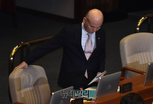이효성 방송통신위원장이 14일 오후 국회에서 열린 교육,사회,문화 분야 대정부질문에서 의원들의 질문에 답하고 자리고 돌아가고 있다.