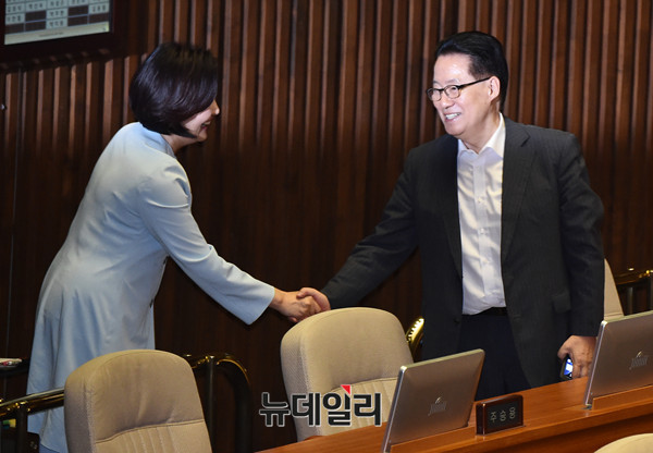 더불어민주당 박영선 의원이 14일 오후 국회에서 열린 교육,사회,문화 분야 대정부질문을 마치고 국민의당 박지원 의원과 인사를 나누고 있다.