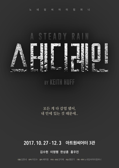 연극 '스테디 레인(A Steady Rain)'이 4년 만에 다시 무대에 오른다.'노네임씨어터컴퍼니 내러티브 시리즈' 중 한 작품으로 2013년 국내 초연된 바 있는 '스테디 레인'은 10월 27일부터 12월 3일까지 아트원씨어터 3관에서 공연된다.극작가이자 유명 TV 시리즈의 프로듀서로 활발하게 활동하고 있는 키스 허프의 대표작이다. 시카고 초연 후 공연 비평가들이 꼽은 '2007 연극 TOP 10'에 선정됐으며, '타임지가 선정한 2009년 TOP 연극'에 오르는 등 작품성과 흥행성을 인정받았다.'스테디 레인'은 모든 것을 자기 방식대로 지켜야하는 대니와 아무 것도 지킬 것이 없는 조이, 두 남자의 삶의 무게감을 고스란히 보여준다. 2인극이라기엔 믿기 어려운 풍부한 스토리와 놀라운 몰입감을 선사한다.이번 재연은 김한내 연출을 필두로 새로운 크리에이티브팀이 합류했다. 공연시간 100분 내내 무대를 떠나지 않고 위기를 맞은 그들의 이야기를 전달할 '대니'와 '조이' 역에는 각각 김수현·홍우진, 이명행·한상훈이 맡는다.연극 '스테디 레인'은 오는 22일 프리뷰켓을 오픈할 예정이다. 전석 4만원. 문의 070-4141-7708.[사진=노네임씨어터컴퍼니]