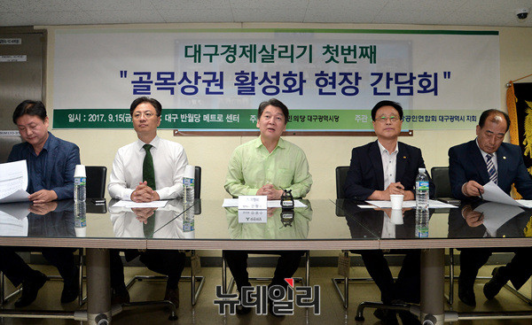안철수 국민의당 대표가 15일 소상공인 사업자들과 만나 "골목상권 활성화를 위해 노력하겠다"고 약속했다.안 대표는 이날 대구 반월동 메트로센터에서 화훼업·외식업 종사자들과 현장 간담회를 갖고 "현장의 목소리를 둘려주면 올바른 해결 방법을 찾아 이번 정기국회에서 내놓겠다"며 "정부 ·여당이 그 안대로 할 수 있도록 요구할 것"이라고 밝혔다.안 대표는 ▲김영란법으로 인해 꽃업계가 침체된 점 ▲최저임금 인상으로 인한 외식업계 고충 ▲카드수수료 부담 ▲대형마트의 상권 침해 등 상인들의 건의사항을 듣고 "이 문제들에 대해 국민의당이 검토 중이고 성과도 있었다"고 말했다.안철수 대표는 김영란 법과 관련해 "여러 업계에서 부작용이 나오고 있다"며 "스승의 날 제자가 카네이션 한 송이를 달아드리는 것도 엄격한데, 어느 정도 부분에 대해 해결할 노력이 필요한 상황"이라고 개선 의지를 내비쳤다.안 대표는 외식업 고충에 대해선 "최저임금 인상으로 (외식 사업장이) 힘든 상황에서 근로시간 특례업종 문제도 해결하기 위해 논의 중"이라고 말했다. 대선 공약이던 신용카드 수수료 인하 방안에는 "정부를 적극적으로 설득한 결과 최근 영세 가맹점은 2억 원에서 3억 원으로 확대됐고 중소기업도 3억 원에서 5억 원으로 오르는 정부안이 나왔다"고 말했다.안 대표는 복합쇼핑몰 및 대형마트 규제에 대한 건의에는 "상생할 수 있는 강제 수단이 없다보니 실효성이 없지만 우리 나름대로 방법을 찾고 있다"며 "당에서 복합 쇼핑몰이나 프리미엄 아울렛 규제 사각 지대를 해소하는 '대규모유통업법개정안'을 발의했다"고 설명했다.