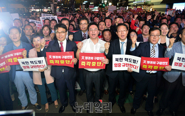 이날 홍준표 대표를 비롯해 정우택 원내대표와 한국당 의원들은 거리에서 시민들을 만나 전술핵 재배치의 필요성 등을 강조했다. (대구=뉴데일리 공준표 기자)