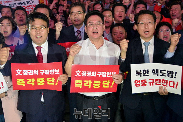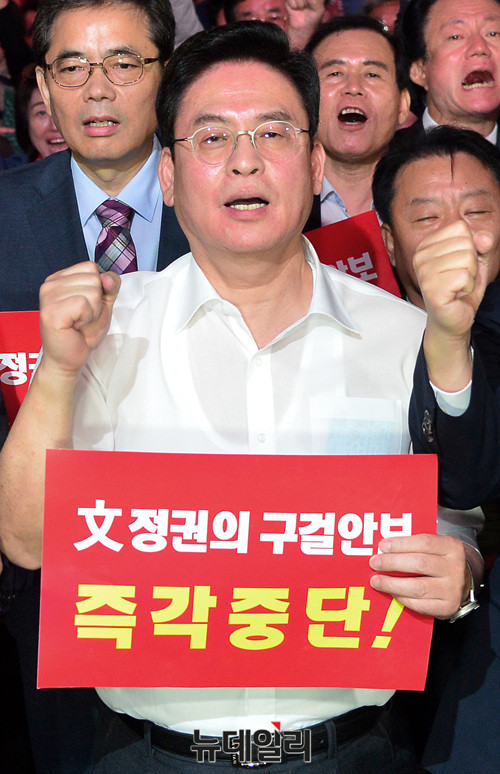정우택 자유한국당 원내대표가 15일 오후 대구 중구 동아백화점 앞 광장에서 열린 '전술핵 재배치 대구·경북 국민보고대회'에 참석해 문재인 대통령의 안보정책을 비판하고 있다.