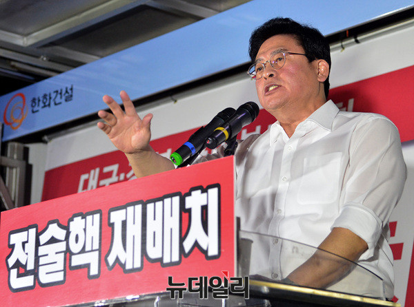 이날 홍 대표와 정우택 원내대표는 대구 거리에서 시민들을 만나 전술핵 재배치의 필요성 등을 강조했다. (대구=뉴데일리 공준표 기자)