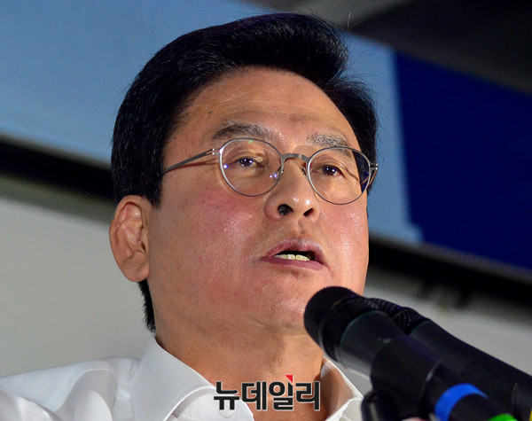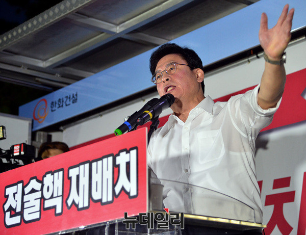 정우택 자유한국당 원내대표가 15일 오후 대구 중구 동아백화점 앞 광장에서 열린 '전술핵 재배치 대구·경북 국민보고대회'에 참석해 발언하고 있다.