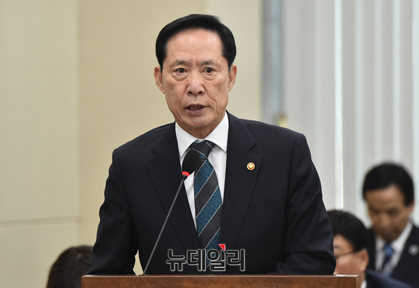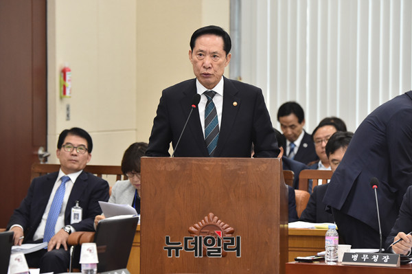 송영무 국방부 장관이 18일 오전 국회에서 열린 국방위원회 전체회의에 출석해 현안보고를 하고 있다.