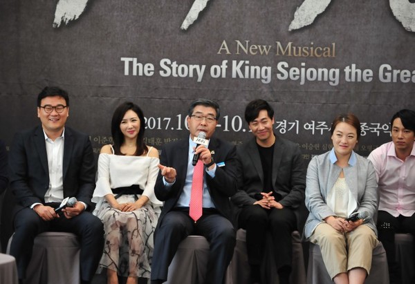 여주시와 함께 제작에 참여한 HJ컬쳐는 '빈센트 반 고흐', '파리넬리', '라흐마니노프', '살리에르' 등 인물을 중심으로 다양한 뮤지컬을 제작하며 작품성을 인정받아 온 공연제작사다.이날 한승원 HJ컬쳐 대표는 "처음에는 너무 뻔한 이야기가 될 것 같아 하지 않겠다고 생각했다. 하지만 무언가를 알고 있다는 것은 너무 무서운 일이더라. 실제로 세종에 대해 왜곡되거나 상당히 잘못 알고 있던 부분이 있었다"고 털어놨다.그러면서 "세종대왕의 일대기에는 드라마적 요소나 강렬한 사건, 갈등 구조가 많다. 올해 HJ컬쳐가 5주년을 맞아 의미있는 작품을 하고 싶었다. 담아낼 이야기가 방대하지만 그간 10편의 작품을 만들면서 쌓아온 모든 역량을 발휘해 명품 뮤지컬을 만들겠다"며 각오를 다졌다.주인공 '세종' 역에는 2017 DIMF어워즈에서 남우조연상을 수상한 박유덕이 맡는다. 역사 속에는 없지만 그의 라이벌로 등장하는 '전해운' 역은 '파리넬리', '샌드백' 등 뮤지컬과 연극을 오가며 다양한 모습을 보여준 이준혁이 캐스팅됐다.세종의 비 '소헌왕후'와 아버지 '태종' 역은 박소연과 김태훈이 출연하며, 뮤지컬 '찌질의 역사', 연극 '아들'에서 활약한 박정원은 '양녕대군-장영실'로 분해 1인 2역을 소화한다. 그 외에 15명의 배우들이 앙상블로 참여해 화려한 액션장면과 군무를 펼친다.박유덕 배우는 "세종대왕 역을 맡아 부담스럽기보다는 영광스럽고 감사하다. 최근 광화문 세종대왕 동상 앞에 가서 '감사하다'고 인사했다"며 "세종이 백성을 봤다면 저는 배우들과 대본을 백성으로 생각하고 캐릭터를 분석하고 있다"고 말했다.