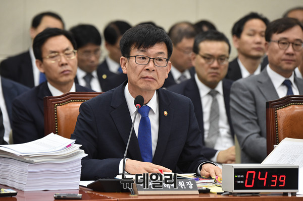 김상조 공정거래위원장이 18일 오후 국회 정무위원회 회의실서 열린 전체회의에 출석해 의원들의 질의에 답변하고 있다.