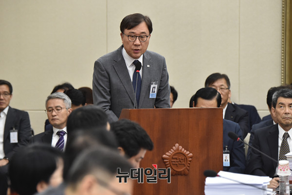 곽범국 예금보험공사 사장이 18일 오후 국회 정무위원회 회의실서 열린 전체회의에 출석해 의원들의 질의에 답변하고 있다.