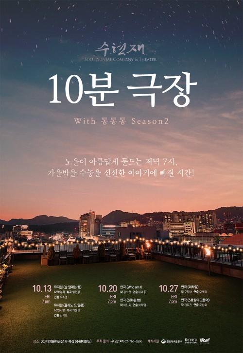 '수현재 10분 극장'의 포스터와 최종 라인업이 공개됐다.'수현재 10분 극장'은 공연제작사 수현재컴퍼니의 작가 데뷔 프로그램 '통통통(通通通) Season2'의 창작 작품을 관객들에게 처음 선보이는 자리다.'통통통 Season2' 최종 선정된 6팀의 신인 작가들은 '수현재 10분 극장' 실연 무대를 통해 신선한 작품 6편을 공개할 예정이다.'수현재 10분 극장'의 포스터는 노을이 물드는 가을밤의 정취와 대학로를 한눈에 내려다 볼 수 있는 옥상무대의 분위기를 담았다.10월 DCF대명문화공장 7층 옥상무대를 채워나갈 작품은 △13일 뮤지컬 '날 달래는 꿈'(작 박경화·작곡 임현정·연출 박소영), 뮤지컬 '몰리노 드 알몬'(작 변가람·작곡 최성실·연출 김지호), △20일 연극 'Who am I'(작 김보현·연출 이대웅), 연극 '정화된 밤'(작 이진욱·연출 박해림), △27일 연극 '미하일'(작 구정아·연출 오세혁), 연극 '5호실의 고등어'(작 김묘진·연출 문삼화) 등 6편이이다.올해 시즌2를 맞은 '통통통'은 신진 창작자들에게 작가 데뷔의 기회를 제공하고, 창작자가 안정적인 환경에서 작품을 개발할 수 있도록 지원해 우수 공연 콘텐츠 개발을 목표로 한다. 최종 선정된 2편은 2018년 4월 쇼케이스 무대에 오른다.DCF대명문화공장 7층 옥상에서 무료로 공연된다. 공연 관람에 대한 보다 자세한 사항은 수현재컴퍼니 공식 페이스북(www.facebook.com/soohyunjae)을 통해 추후 공지될 예정이다. 문의 02-766-6506.[사진=수현재컴퍼니]