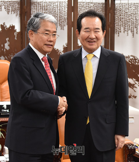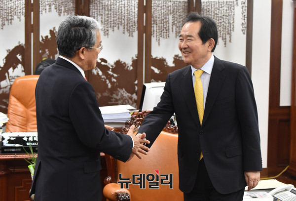 정세균 국회의장과 국민의당 김동철 원내대표가 19일 오후 국회 의장실에서 열린 여야 4당 원내대표 회동에서 인사를 나누고 있다.