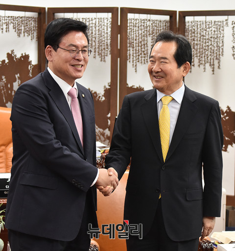 정세균 국회의장과 자유한국당 정우택 원내대표가 19일 오후 국회 의장실에서 열린 여야 4당 원내대표 회동에서 인사를 나누고 있다.