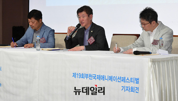 윤갑용 조직위원장이 20일 오전 한국프레스센터 국제회의장에서 열린 부천국제애니메이션페스티벌(BIAF2017) 기자회견에 참석해 인사말을 하고 있다. 부천국제애니메이션페스티벌은 '애니+펀(Ani_Fun)을 주제로 '오는 10월 20일부터 24일까지 한국만화박물관 상영관을 비롯한 부천일대에서 개최된다. 올해 상영작은 37개국 149편. 개막작은 벤자민 레너 감독의 '빅 배드 폭스(The Big Bad Fox and Ither Tales)'가 선정됐다.