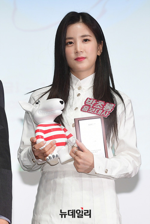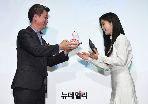 윤갑용 조직위원장이 20일 오전 한국프레스센터 국제회의장에서 열린 부천국제애니메이션페스티벌(BIAF2017) 기자회견 직후 위촉식에서 에이핑크 초롱에게 위촉패와 캐릭터 인형을 전달하고 있다.