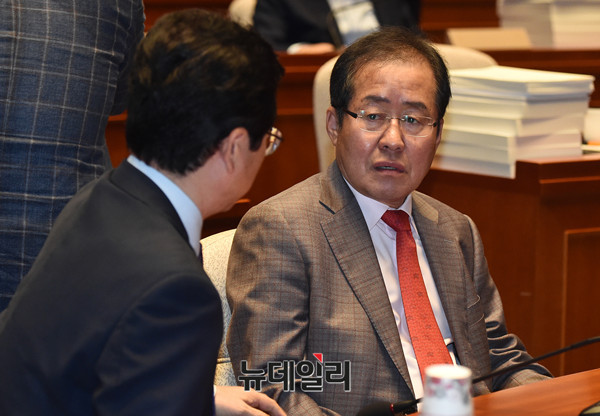 홍준표 자유한국당 대표가 21일 오전 국회서 열린 의원총회에 참석해 이철우 의원과 대화를 나누고 있다.