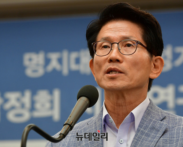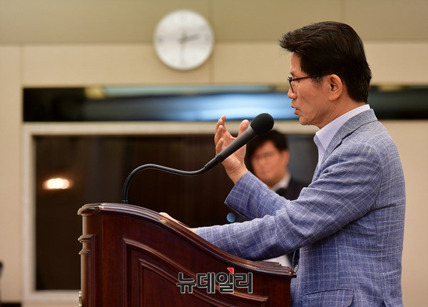 김문수 전 경기지사가 20일 오후 한국프레스센터에서 열린 명지대학교 정기학술포럼 100회 기념 학술대회에 참석해 축사를 하고 있다.