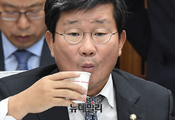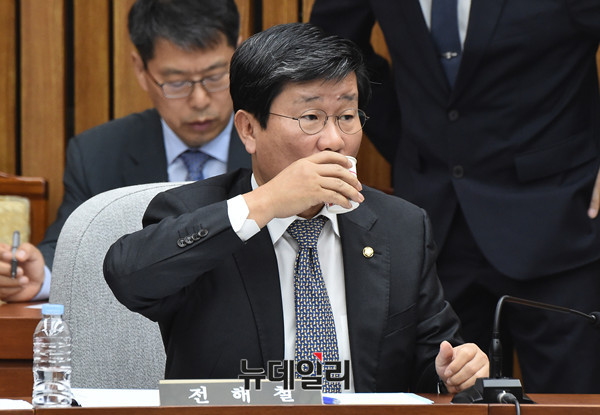 전해철 더불어민주당 의원이 20일 오후 국회에서 열린 김명수 대법원장 후보자 인사청문특별위원회 전체회의에서 물을 마시고 있다.