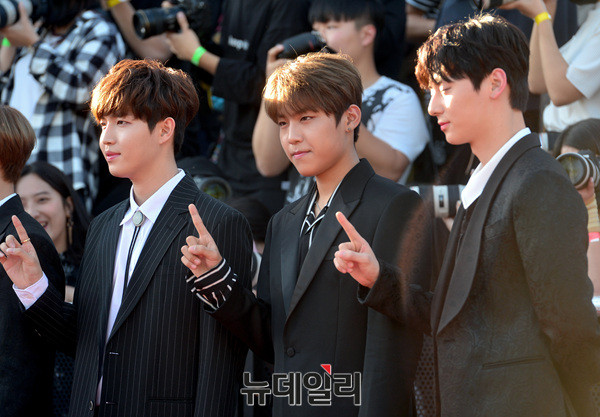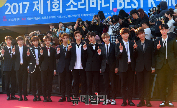그룹 워너원(Wanna One : 강다니엘, 박지훈, 이대휘, 김재환, 옹성우, 박우진, 라이관린, 윤지성, 황민현, 배진영, 하성운)이 20일 오후 서울 송파구 잠실학생체육관에서 열린 '2017 제1회 소리바다 베스트 케이뮤직 어워즈(2017 1st SORIBADA BEST K-MUSIC AWARDS)'에 참석해 포즈를 취하고 있다. 이날 행사에는 그룹 워너원, 엑소, 트와이스, 레드벨벳 등이 참석했다.