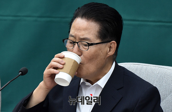 국민의당 박지원 의워이 21일 오전 국회에서 열린 김명수 대법원장 후보자 임명동의안 처리 관련 의원총회에서 차를 마시고 있다.