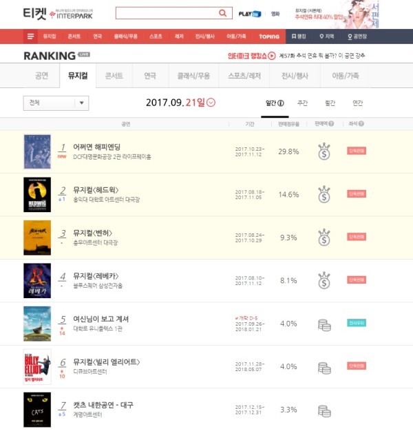 뮤지컬 '어쩌면 해피엔딩'의 앙코르 공연이 티켓오픈과 동시에 전석 매진됐다.'어쩌면 해피엔딩'은 가까운 미래의 서울을 배경으로, 구형이 돼 버려진 채 홀로 살아가는 두 헬퍼봇 올리버와 클레어를 통해 급변하는 세상 속에서 고립돼가는 인간의 모습을 따뜻한 시선으로 그린다.지난해 총 97회 공연 중 60회가 전석 매진을 기록하는 등 창작 뮤지컬 초연으로는 이례적인 흥행을 이뤄낸 바 있다.책임 프로듀서인 최정길(대명문화공장) PD는 "초연 당시 관객 분들의 뜨거운 관심과 성원을 바탕으로 앙코르 공연을 준비한 만큼, 배우와 스텝, 관객들 모두가 즐거운 공연이 되도록 노력하겠다"고 밝혔다.뮤지컬 '어쩌면 해피엔딩'은 서정적인 가사와 선율로 2012년 한국뮤지컬대상과 더뮤지컬어워즈에서 작사작곡상을 받은 박천휴 작가 & 윌 애런슨 작곡가 콤비의 두 번째 작품이다.이번 재연에는 김동연 연출이 참여하며, 트라이아웃 공연 때부터 함께한 전미도, 고훈정, 정욱진을 비롯해 초연을 흥행으로 이끈 김재범, 정문성, 최수진, 성종완이 출연한다. 10월 23일부터 11월 12일까지 대명문화공장2관 라이프웨이홀에서 공연된다.관람료 4만~6만원. 문의 02-766-7667.