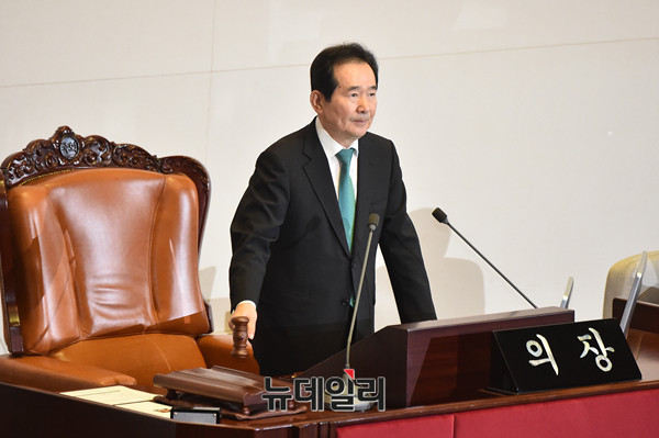 정세균 국회의장이 21일 오후 국회에서 열린 본회의에서 '김명수 대법원장 후보자 임명동의안'을 상정하고 있다.