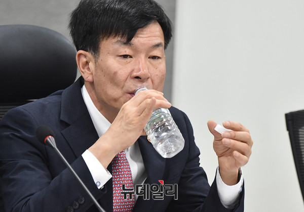 김상조 공정거래위원장이 22일 오전 국회 의원회관에서 바른정당 주최로 열린 '가맹점 갑질 근절 2차 정책간담회'에 참석해 회의를 지켜보고 있다.