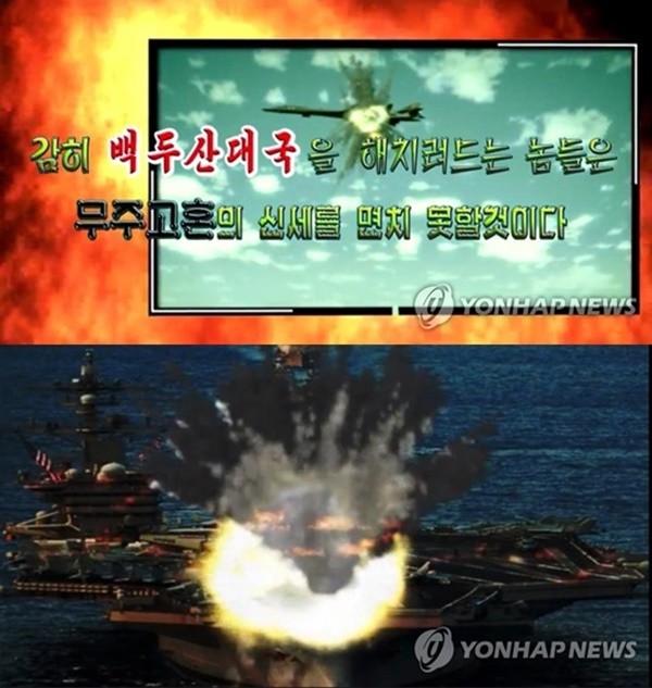 또 영상에는 SLBM으로 미국의 핵 추진 항공모함 칼빈슨호를 타격하는 모습이 담기며 “F-35, B-1B, 칼빈슨호 선두에 서봐라, 선두에 서는 순서가 곧 무덤으로 가는 순서다”라는 자막이 나타나기도 했다.