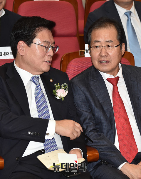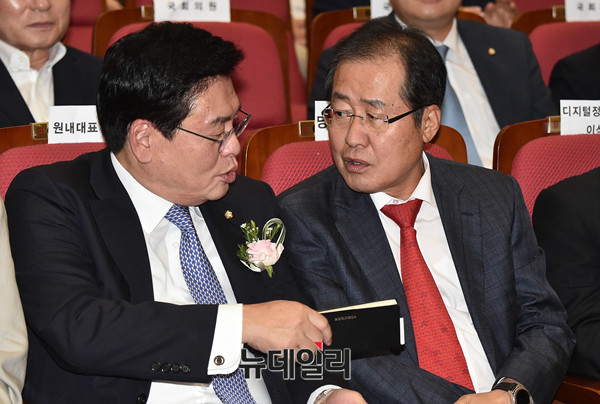 자유한국당 홍준표 대표가 25일 오후 국회 의원회관에서 열린 자유한국당 '디지털정당위원회 출범식'에 참석해 정우택 원내대표와 대화를 나누고 있다.