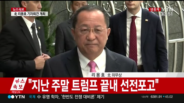 연합뉴스에 따르면 리 외무상은 지난 25일 뉴욕 밀레니엄 힐튼 유엔플라자 호텔에서 기자회견을 갖고 “그간 말싸움이 행동으로 이어지지 않길 소원했다”고 입을 열었다.