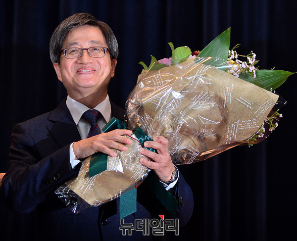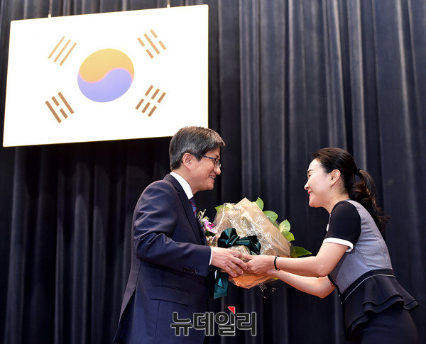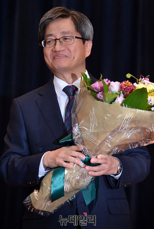 김명수 신임 대법원장이 26일 오후 대법원에서 열린 취임식에 참석해 꽃다발을 전달받고 있다.