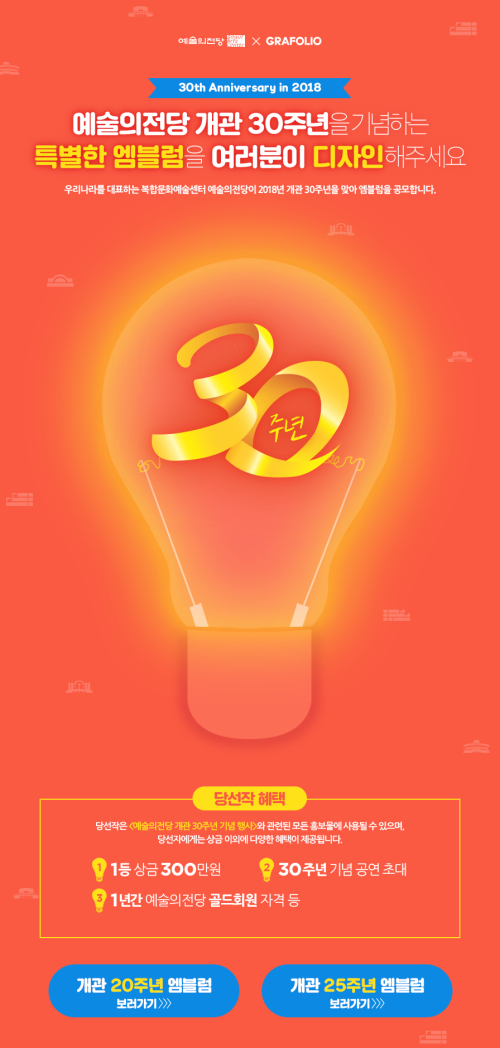 예술의전당(사장 고학찬)이 개관 30주년을 맞아 엠블럼을 공모한다.예술의전당은 개관 30주년을 축하하는 다채로운 예술행사의 홍보에 활용할 대표 이미지를 발굴하기 위해 포털 네이버의 창작 콘텐츠 플랫폼 그라폴리오와 함께 공모한다고 27일 밝혔다.디자인 공모에는 누구나 참여할 수 있으며, 9월 26일부터 10월 25일까지 네이버 그라폴리오 홈페이지(http://www.grafolio.com/collaboration/148)에서 접수하면 된다.공모작은 네이버 그라폴리오를 통해 PNG 또는 JPG 파일로 1인당 3개 작품까지 지원할 수 있다. 당선작은 A4 사이즈, ai(벡터)파일의 형식으로 제출하면 된다.심사는 ▲주제 연관성 ▲독창성 ▲예술성 등의 기준으로 예술의전당의 심사위원 점수 70%와 그라폴리오 회원 투표점수 30%를 합산하여 이뤄진다. 당선작은 11월 7일 발표될 예정이다.당선자 1인에게는 ▲상금 300만원 ▲예술의전당 30주년 기념 공연 초대 ▲예술의전당 골드회원권(1년) ▲예술의전당 정기간행물에 작가와 작품 소개 등이 제공되며, 가작 수상자 3인에게는 상금 30만원과 여러 혜택이 각각 주어진다.고학찬 예술의전당 사장은 "이번 엠블럼 공모가 지난 30년 동안 국내 최고의 아트센터로 자리매김 한 예술의전당이 앞으로도 국민과 함께하는 공공기관으로 나아가겠다는 뜻을 담고 있다. 많은 분들이 참여해주길 바란다"고 밝혔다.[사진=예술의전당]