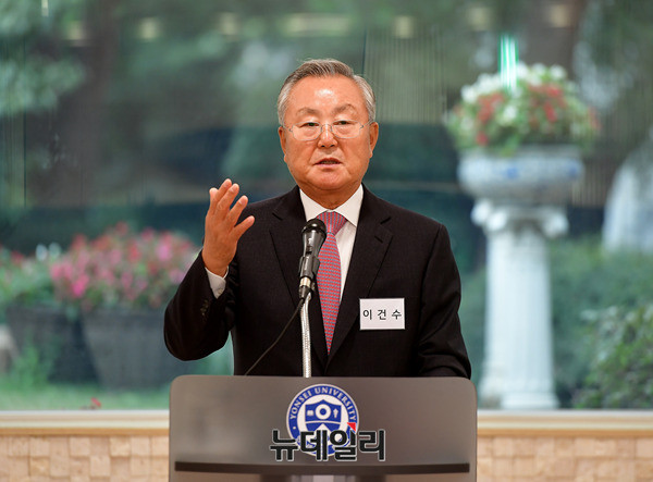 이건수 동아일렉콤 회장이 26일 오후 서울 서대문구 연세대학교 알렌관에서 열린 이승만전집 발간위원회 창립모임에서 축사를 하고 있다. 이승만전집은 2017년부터 2026년까지 이승만 박사가 남긴 모든 저작물을 수집, 편집, 교정 등의 작업을 거쳐 총 35권으로 출간할 예정이다.