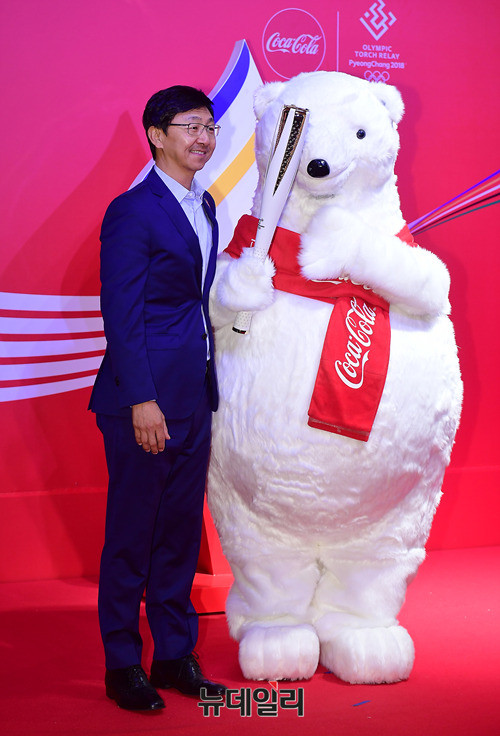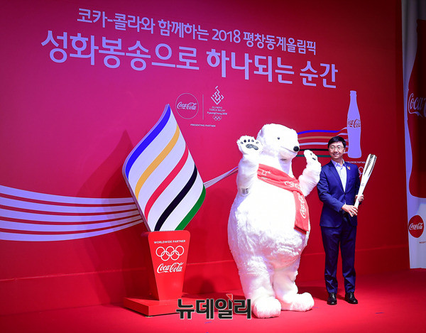 이창엽 한국코카콜라 사장이 27일 서울 중구 더플라자호텔에서 열린 '코카-콜라와 함께 하는 2018 평창동계올림픽, 성화봉송으로 하나되는 순간' 행사에서 성화를 들고 포토타임을 갖고 있다.